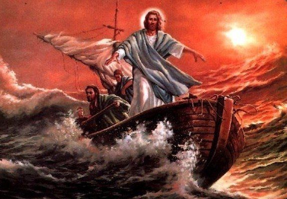 Ontzet over het gebeuren, vielen de mannen op hun knieën en aanbaden Hem, zeggende: "Waarlijk Jezus, U bent de Zoon van God".